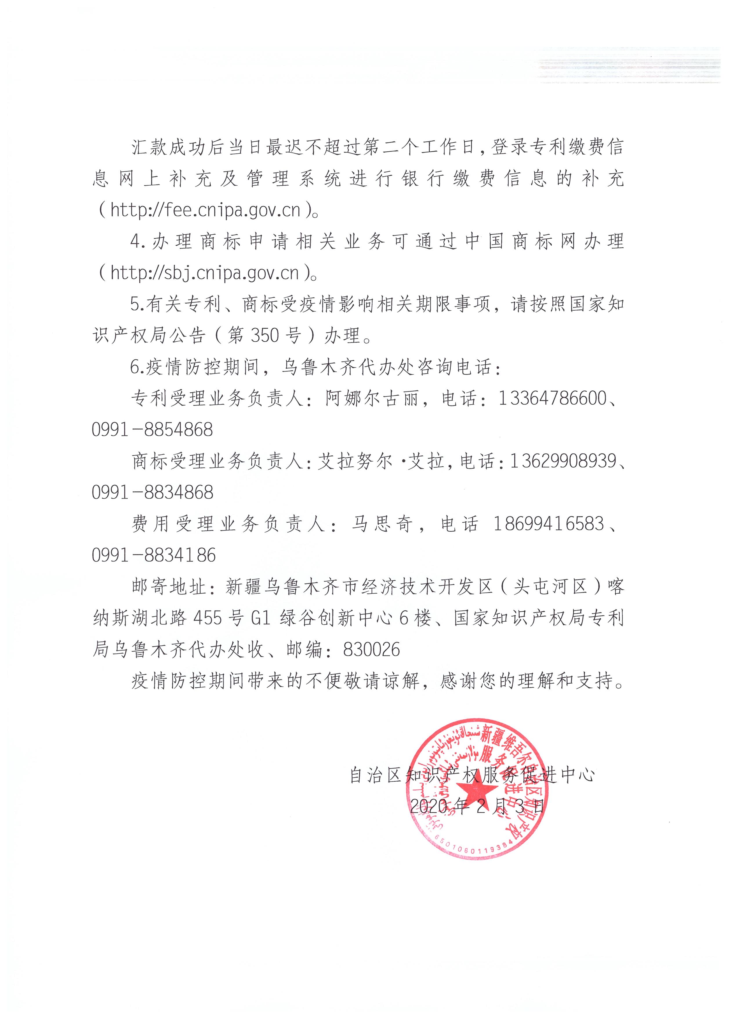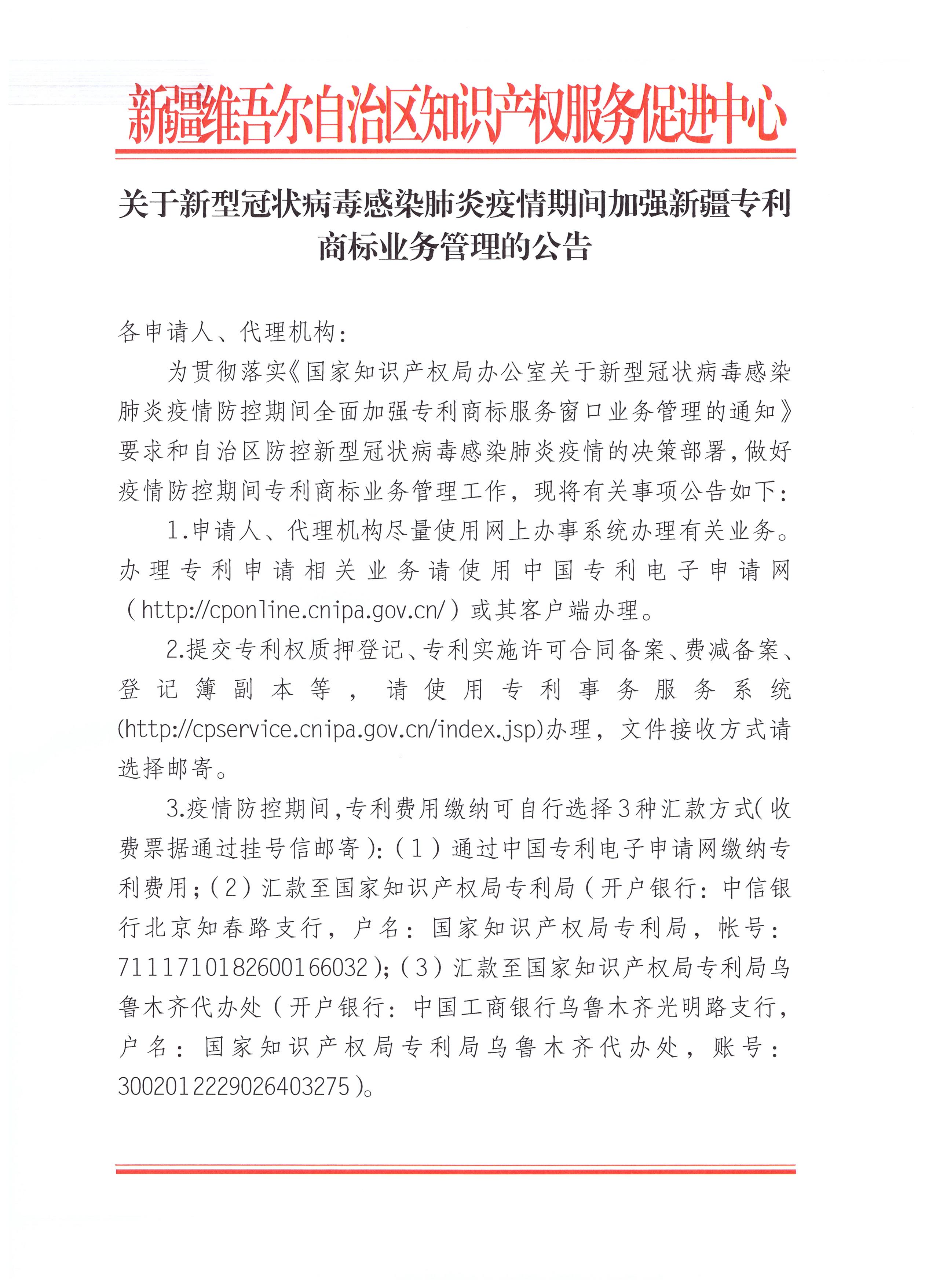 关于新型冠状病毒感染肺炎疫情期间加强新疆专利 商标业务管理的公告